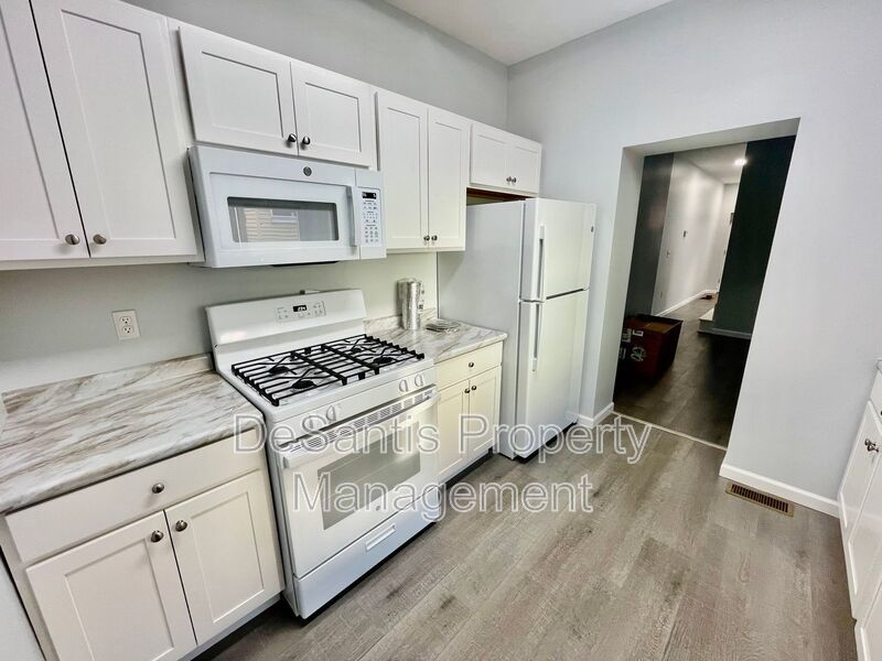 Inside, you’ll find updated vinyl flooring throughout and a bright, functional layout. The kitchen is equipped with a gas range, refrigerator, and microwave, with ample cabinet space and room to cook comfortably. The main level also features a convenient half bath, while upstairs you’ll find two spacious bedrooms filled with natural light and a full bathroom with modern fixtures.